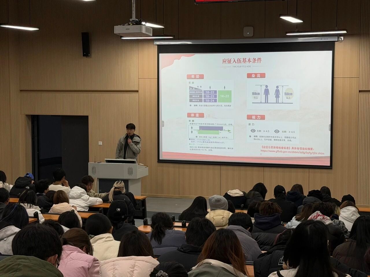 (文/潘蕊琦 图/牛晨宇)为进一步落实征兵工作要求,激发大学生参军报国热情,近日,我院2025级开展征兵政策宣讲。辅导员汪丰毅化身“政策讲解员”与“军营故事分享者”,为怀揣报国之志的学子搭建起通往军营的沟通桥梁,让参军报国的种子在青春校园落地生根,让保家卫国的信念在学子心中愈发坚定。
