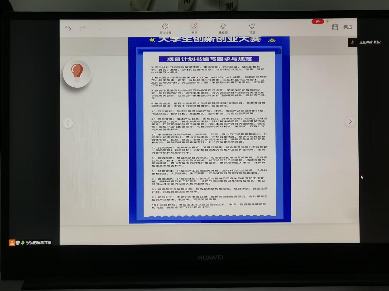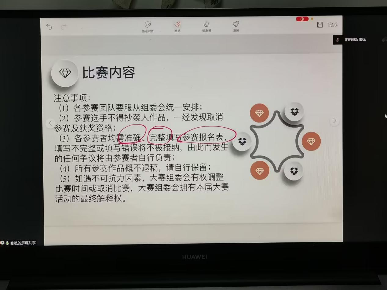 会议最后,张弘老师强调了比赛时的注意事项,她希望同学们能积极参加本次活动,发挥自己的才能,在团队中勇于创新,积极进取,为明年挑战杯做好准备。