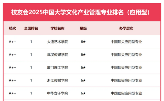 文化产业管理专业创立于2011年,已逐步构建起“文化+传媒+管理”交叉融合的学科体系。在“校友会2025中国大学文化产业管理专业排名(应用型)”中荣获中国六星级应用型专业,入围中国顶尖应用型专业行列,荣登榜首。