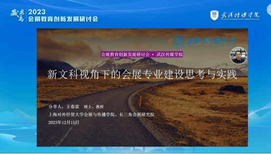 上海对外贸易大学会展与传播学院院长、教授王春雷以《新文科视角下的会展专业建设思考与实践》为题进行发言。王春雷教授从新文科的概念出发,从构建话语体系、交叉融合、科技应用与数字会展、对接职业发展、服务产业和生活五个方面分享了上海对外经贸大学会展专业如何进行新文科建设,为会展教育的创新提供了极有价值的参考。