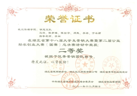 陈喆宇同学不断参与专业相关的比赛,并在各项比赛中取得优秀成就,在校期间获得若干A类赛事奖项,如2022全国高校商业精英挑战赛品牌策划竞赛全国三等奖。共获国家级荣誉5个,省级荣誉5个,校级及以上30余个。同时陈喆宇同学在校期间注重个人发展,心系院校,创立武汉叁零壹柒文化创意有限公司和吾传说文创空间,服务于全校师生提供三品转化平台。