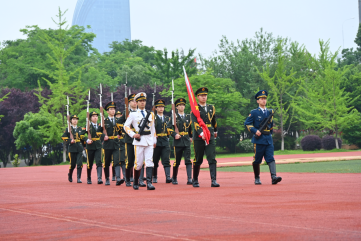 伴随着激昂雄壮的国歌声,升旗手将国旗抛向空中,五星红旗迎风飘扬,全体师生庄严肃立,向国旗行注目礼。