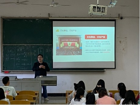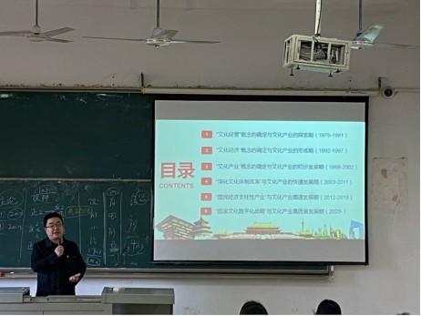 党课过程中,蒋冬青通过介绍文化产业在各个时期的发展状况,结合中国经济的 “三位一体”布局、文化市场的快速发展,将文化产业政策的完善和政府对文化产业发展的推动作出了详细说明。他指出,深化文化体制改革后,文化产业进入快速发展期。蒋冬青通过介绍文化产业与文化事业相结合的成功案例,向同学们介绍了“四位一体”、强化事业属性的公共功能,以及让事业单位成为市场化竞争的主体。他通过分析各个时期文化产业的特点,引出中国特色社会主义进入新时代后,文化产业逐步成为国民经济支柱性产业,文化产业得以高质量发展。