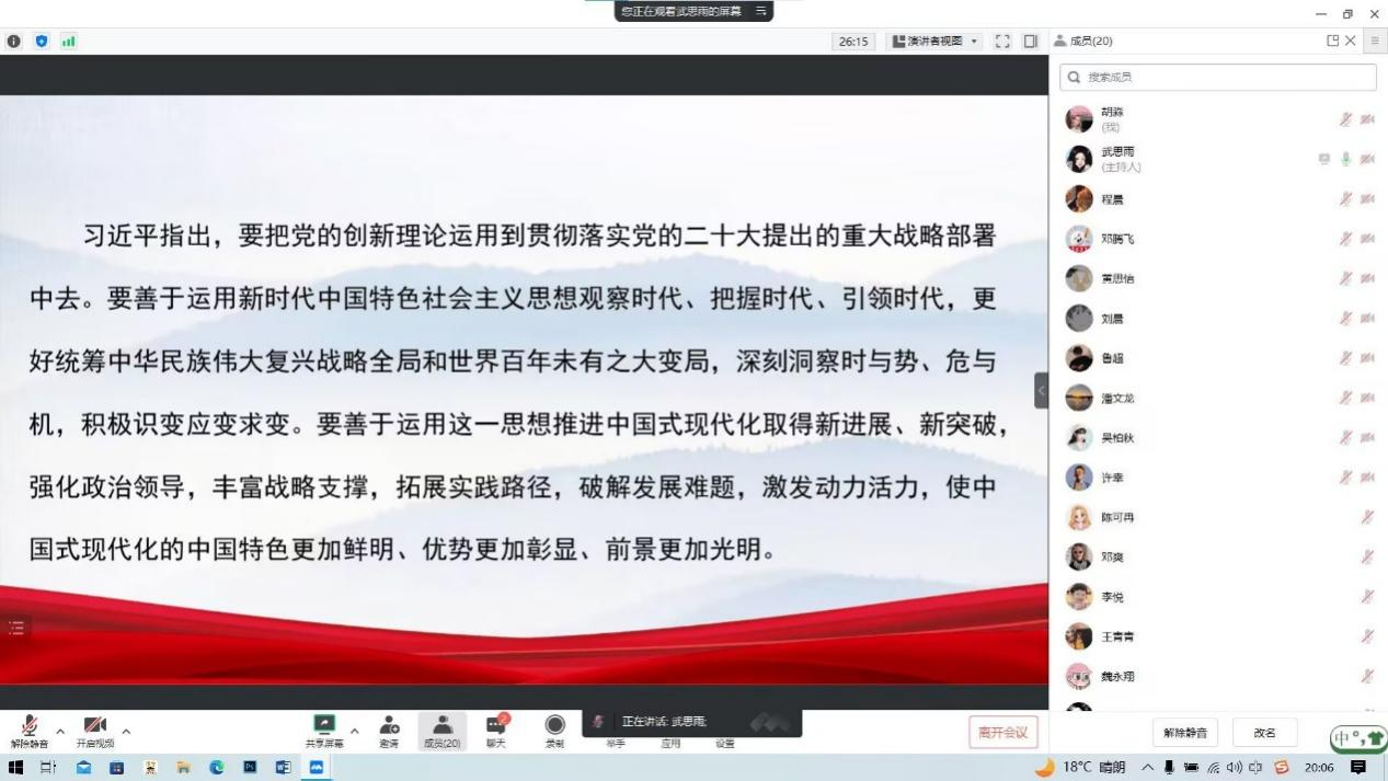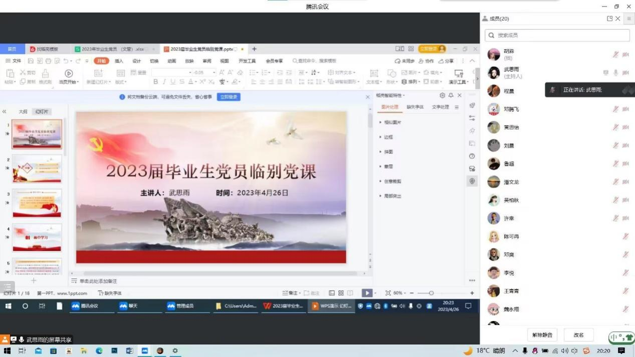 2023届毕业季即将到来,为进一步做好毕业生党员的思想教育,引导青年深入学习贯彻习近平新时代中国特色社会主义思想,坚定理想信念永远跟党走,勇担青年党员使命。我院于2023年4月26日晚20:00在线上开展了“2023届毕业生党员临别党课”主题教育活动,由党总支部组织委员武思雨主讲,参会人员为yl6809永利集团学生第一党支部书记王喆、学生第二党支部书记陈可冉以及2023届全体毕业生党员。