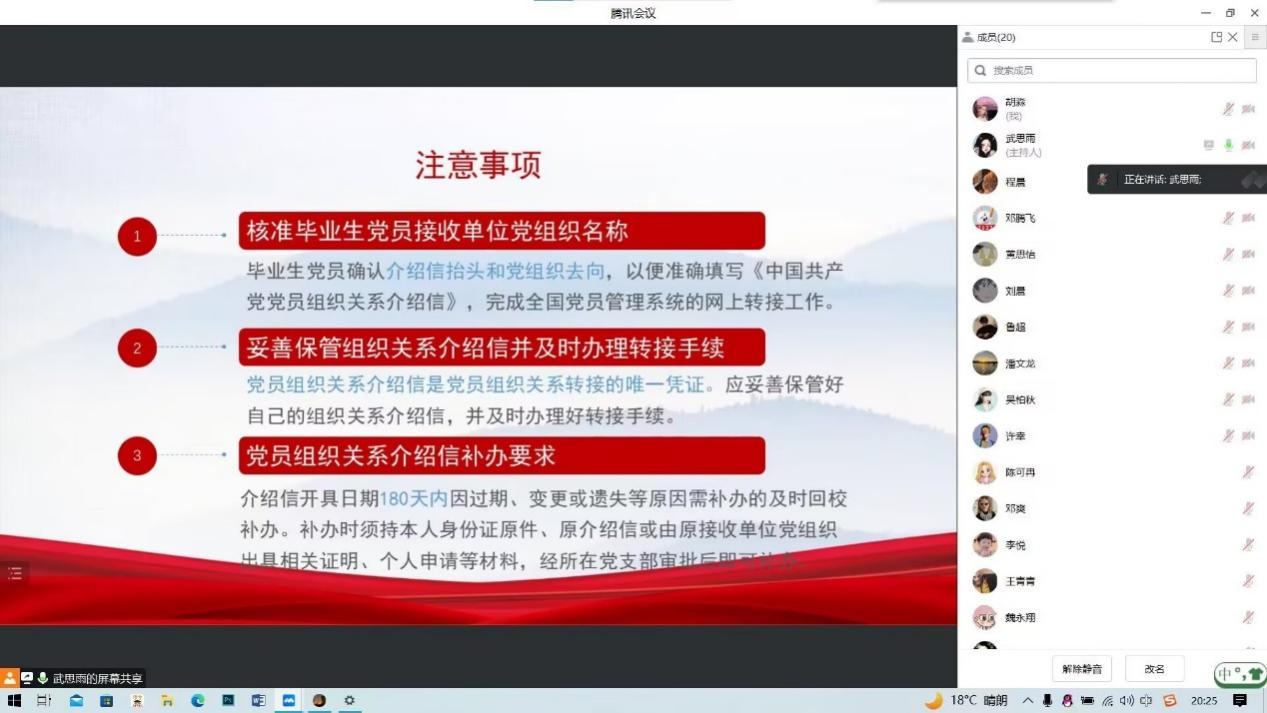 会议最后,对于毕业生党员组织关系转接问题,武思雨作出了详细的讲解,告诉党员们有关组织关系转接前期工作、转接政策、转接流程等操作方法以及注意事项,同时也对各位毕业生党员表达了祝福,希望通过此次党课,能够让大家坚定自己的理想信念,不忘初心、牢记使命。