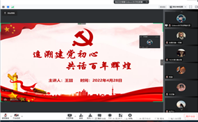 为回顾党的光辉历程,进一步深入学习党的光荣历史,传承红色基因,增强我院党员同志们的现实责任感和历史使命感,我院于2022年4月28日11:50通过腾讯会议开展了“追溯建党初心,共话百年辉煌”线上主题党课。本次党课由学生第一党支部书记王喆主讲,与会人员为第36期党校学员及党总支部全体党员。