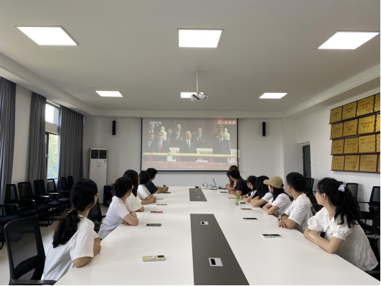 在5312会议室,学院全体教职工整齐落座,目光聚焦前方大屏幕,通过电视直播同步收看阅兵盛况,现场氛围肃穆而专注。