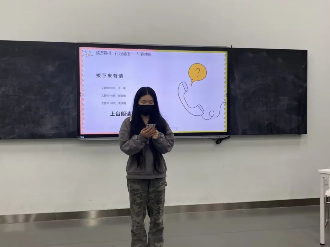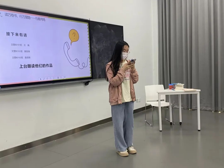 出席本次活动的领导老师有团委书记汪丰毅老师。本次活动主要分为“与春共鸣”朗读者、“与春共绘”创意卡片、“图书漂流”读后感、宣读获得“优秀作品奖”的人员名单并进行颁奖四个部分。