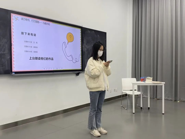 活动伊始,“获得优秀作品奖”的王佩、郭亚微、袁琪琪这三位同学,她们饱含着朴素与真挚的感情为我们分享了朗读的内容。伴随着她们生动、真切的诵读,我们的精神也随之牵引,深刻的共勉到了她们积极活跃的人生态度。