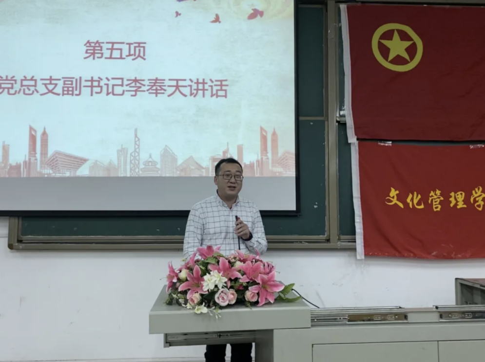紧接着,党总支副书记李奉天老师上台讲话。他强调在大学生活中要树立自己的人生目标,践行人生规划。他希望身为学生干部要认真学习马克思主义思想理论,并将它融入到今后的学习生活工作的当中, 学生干部作为学生基层组织各种活动和工作的组织者和领导者,要具有较高的政治觉悟和思想品质,发挥先锋模范作用,为学院的老师和同学们服务,同时明确自己所肩负的重托,在今后的工作中增强“四个意识"、坚定”四个自信“、做到“两个维护”,为学院及学校的建设贡献属于自己的一份力量。
