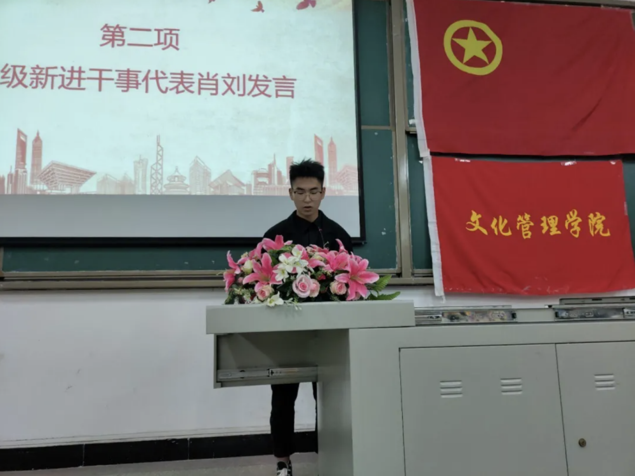 典礼开始,全体起立,奏唱国歌。典礼在雄壮的歌声中拉开帷幕。2020级新生肖刘同学代表新进干事发言。他认为,作为学生干部,应该具有较高的政治觉悟和思想品质、较强的专业素质和知识结构、较好的人为处事综合能力、较优的心理素质以及团队观念。我们作为新时代的中国青年,要以马克思主义为指导,勤奋学习、统筹兼顾,用实际行动证明自己,珍惜此次学习机会,在接下来的干部培训班中学有所获。