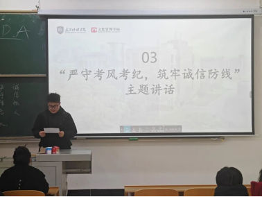 随后,王喆围绕“严守考风考纪,筑牢诚信防线”作主题讲话,他从治学精神传承与个人品格塑造的角度出发,娓娓道来诚信考试对学业成长、价值养成的重要意义,话语恳切真挚,引发在场学生的强烈共鸣。
